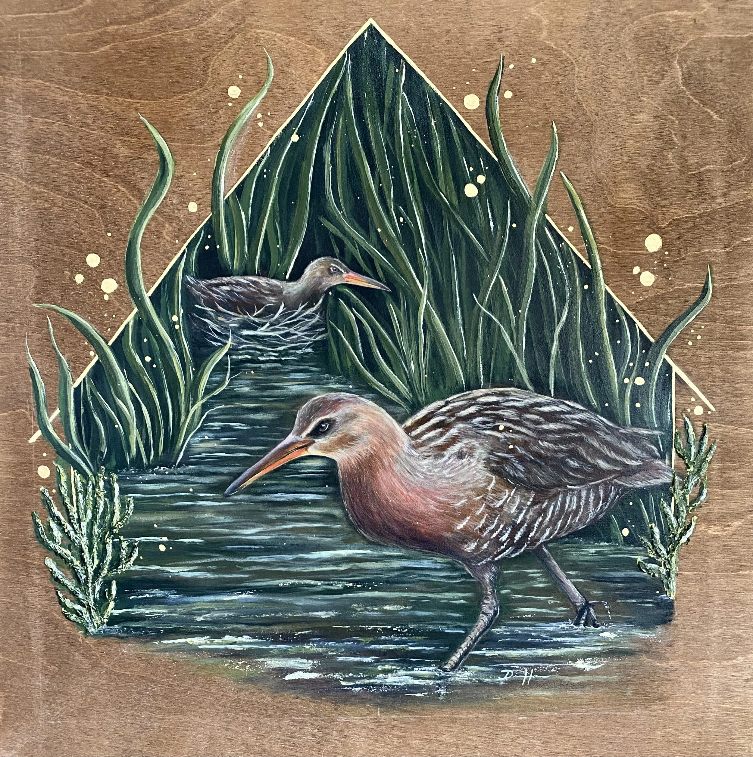 Light-footed Ridgeway’s Rail. Watercolor and soft pastel on green toned paper. 2025